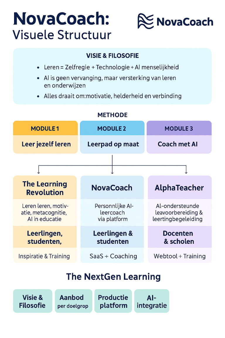 Met de inzichten van The Learning Revolution als basis, brengt NovaCoach.ai de kracht van AI direct naar leerlingen en studenten. Dit platform is jouw persoonlijke, adaptieve leercoach. NovaCoach.ai helpt je jouw unieke leerstrategie te achterhalen en te optimaliseren door middel van intelligente feedback, gepersonaliseerde oefeningen en adaptieve leertrajecten. Het is de slimme partner die zich aanpast aan jouw behoeften, zodat je efficiënter en effectiever leert.